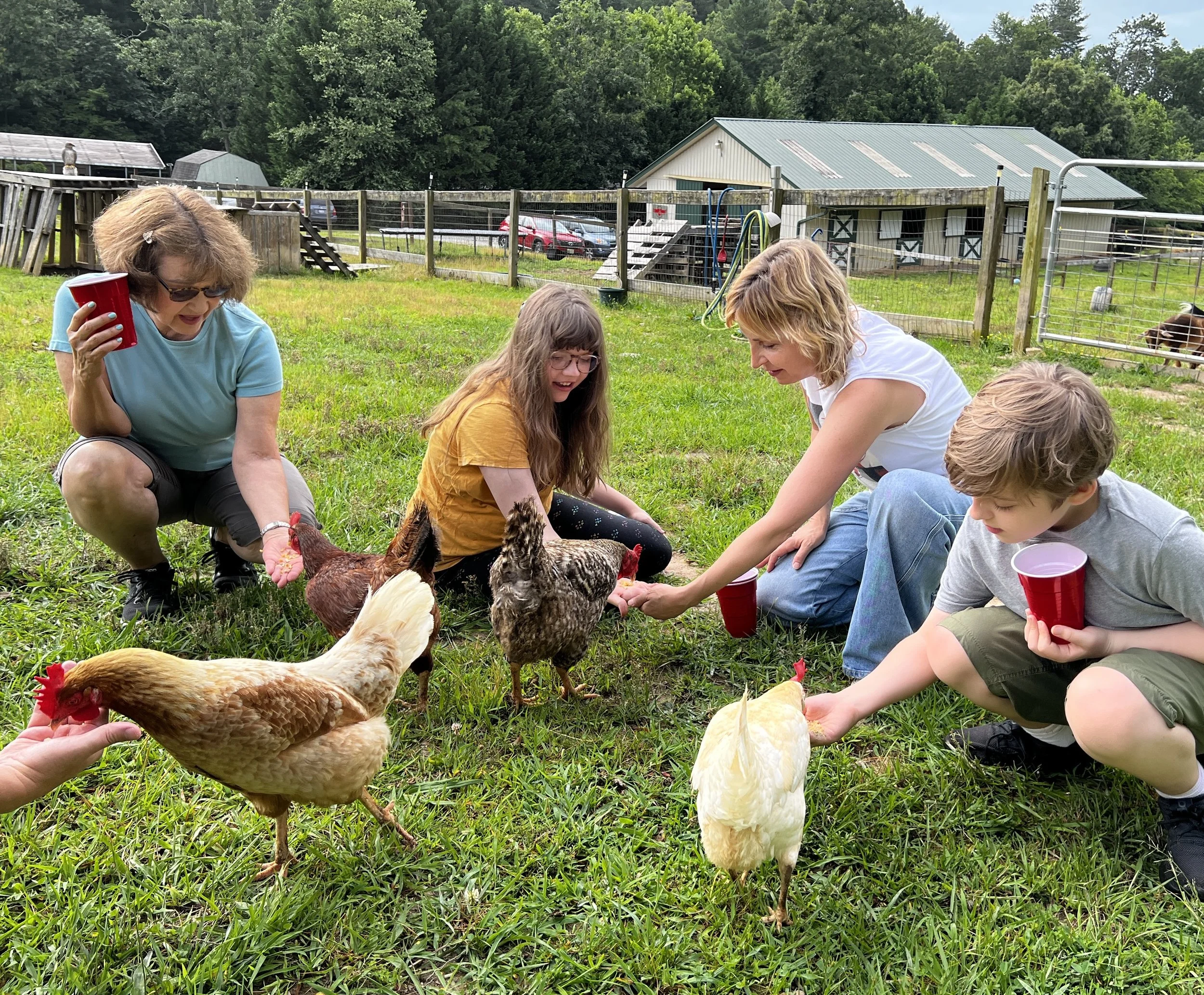We are handicap accessible; however, all activities are outdoors and the farm’s terrain is grass and gravel, so please consider your mobility needs prior to visiting. Let us know in advance so we can discuss if we are a good fit for your accessibility needs prior to your arrival. The creek is accessible if you are willing to drive your car on a bumpy dirt road. Four-wheel drive is recommended for visits to the creek.