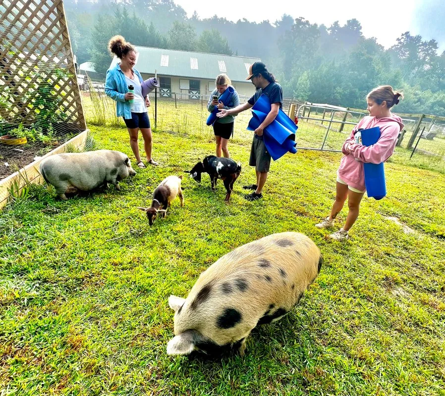 Experience a unique twist on "Goat Yoga" with our Farm Yoga ! Enjoy 90-minutes of laughter, self-care, relaxation and fun. Not only will you be joined by our goats, Lady Baba and Jelly Georgia, but also our pigs, Dolly Porkon and Barbie Q Bacon, and our six chickens!
